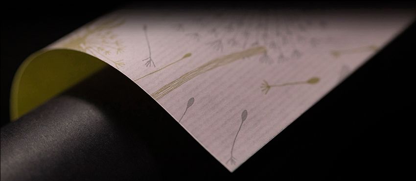 This double-sided wrapping paper from the Varenna collection brings romance and nature to any gift. A pastel pink front features delicate dandelion motifs in olive and gray tones, combined with a solid olive green back. Made from white Eco Kraft paper for a luxurious, tactile look – perfect for parties and special occasions.